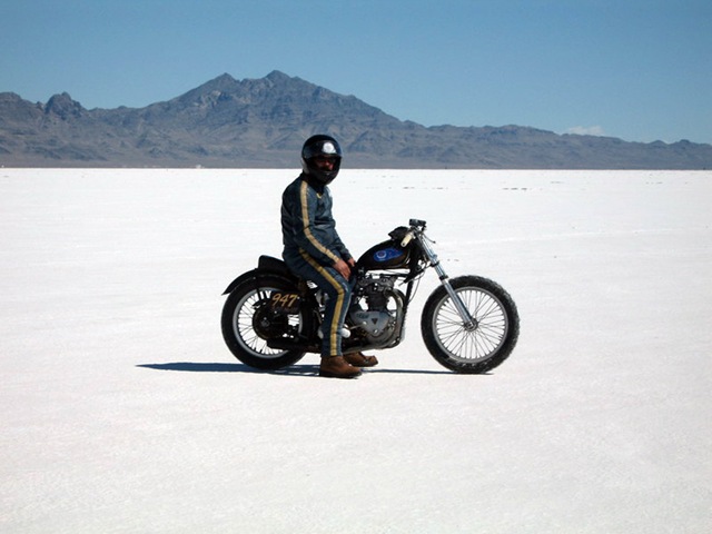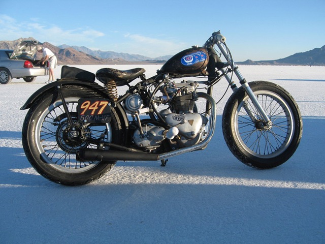 Aces team in racing their vintage Triumphs at the Bonneville Salt Flats during Speedweek. The team consists of Wes White (1951 TR5), Chris Hamilton (1952 Triumph 650), and Chuck Zeglin (1955 Triumph Cub). The shirts are in white only, and available in limited quantities, get one while they last and help keep vintage racing alive.
