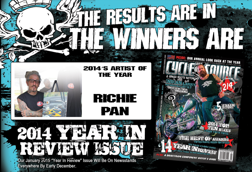 The complete official awards announcement will be available to the general public on retail magazine newsstands everywhere beginning December 2, 2014. The “Year In Review” issue (January 2015), as it is referred to, will also contain a look back over the past twelve months in the custom motorcycle industry and the culture that surrounds it. Additionally the top ten custom bike features and best pin-up of 2014, as voted by Cycle Source readers are featured.
