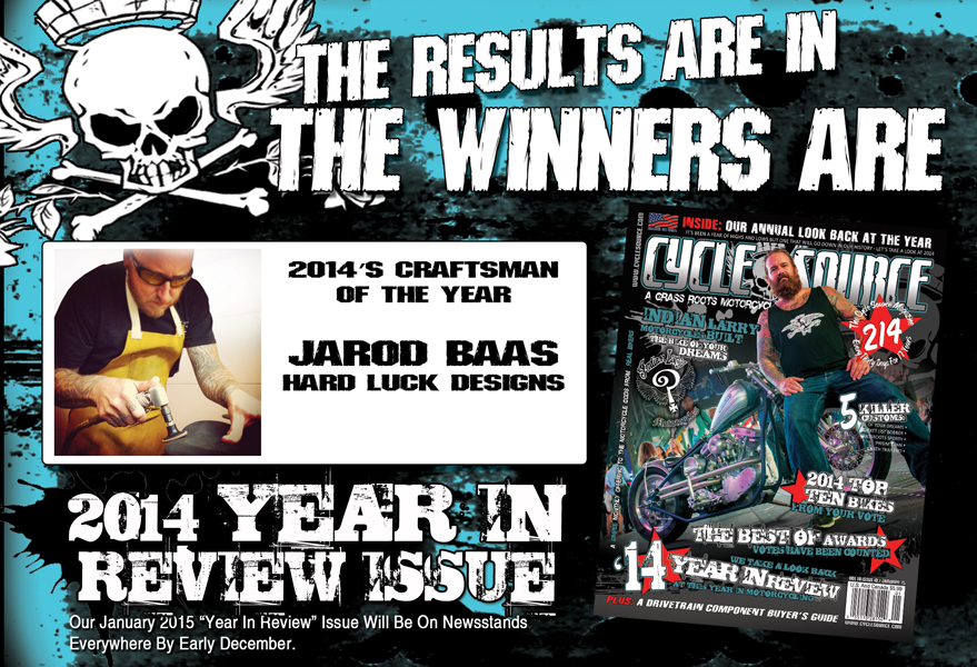 This year the readers of the Cycle Source Magazine voted Jarod Baas – Hard Luck Designs as 2014’s craftsman of the year. His work is incredible and his story even more so, and for this, we are happy to name him as the 2014 Cycle Source Magazine Readers’ Craftsman of