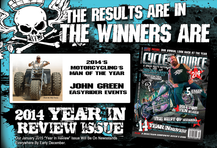 This year the readers of the Cycle Source Magazine voted John Green – Easyrider Events as 2014 motorcycling’s Man of the year. His memories and lessons will live on in so many of us and allbeit posthumously, we are honored to name John Green as the 2014 Cycle Source Readers’ Motorcycling’s Man of the Year!