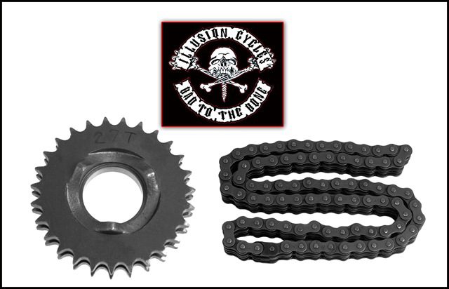 Illusion has just released their highly anticipated 27 TOOTH MOTOR SPROCKET conversion kit for a variety of popular HD 5-speed machines. The sprocket and chain swap alters the drive ratio to reduce running RPM on the top end and has proven to provide 8% higher cruising speeds without a 6-speed box. Just the ticket for big inch motors with plenty of torque. Each kit comes complete with application specific chain and 27 tooth motor sprocket. Simple to install all you need is a primary gasket, quart of primary oil and about an hour of wrench time. The conversion fits easily inside the stock OEM primary chain case and replacement chains are available from Illusion. Part # ILLU:10-2547 fits Softail® machines 1990-2006 and Dynas® 1994-2005. Part # ILLU:10-2567 fits directly to 1990-2006 FXR and FLT models. And get this, the complete kit sells for just $122.95. For complete details contact Illusion Motorsports at 714-894-1942, email to ILLUSIONOC@GMAIL.COM or visit them on the Web at www.illusionmotorcycles.com. Dealer inquiries welcome.