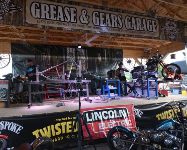 Sturgis, SD July 2017 :Last year Cycle Source Magazine and the Iron Horse Saloon launched a brand-new type of rally entertainment, the Grease & Gears Garage. Over a six day span some two dozen individual builders from the custom motorcycle industry took the stage to present to onlookers the nuts and bolts of what they do. Segments on welding, suspension, frame building and working the tools in a fabrication shop were all played out in front of the entire crowd at the Iron Horse Saloon but also to the world audience via FaceBook Live.