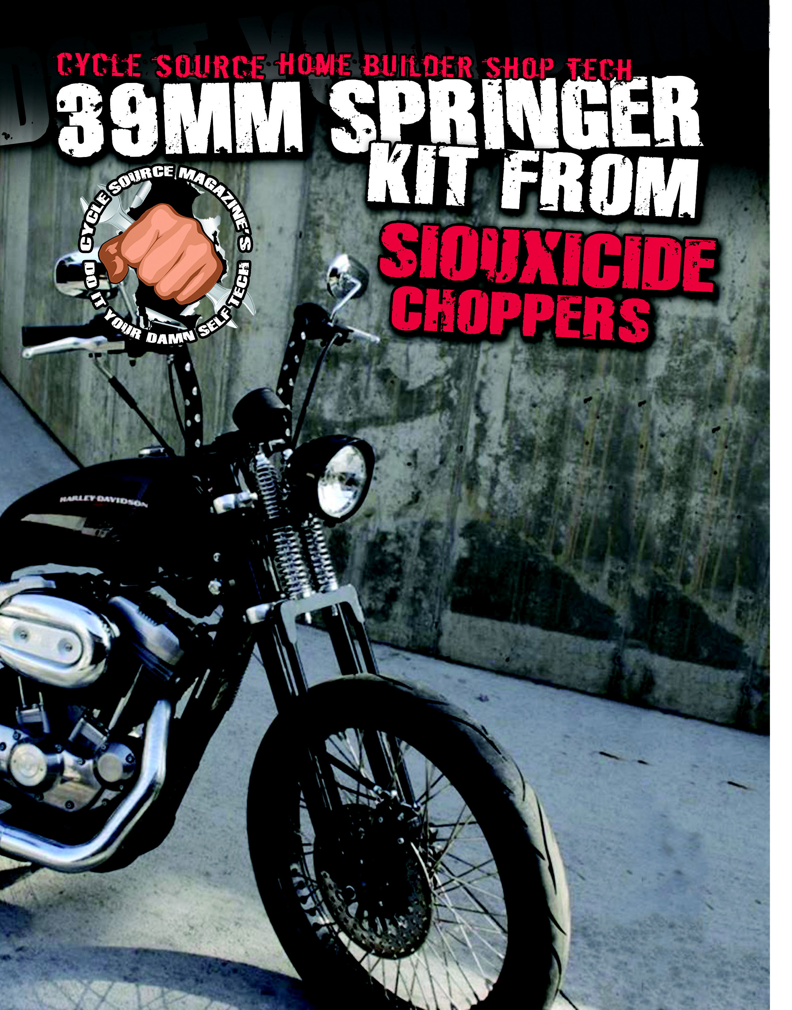 I ran into the cats from Siouxicide Choppers a while back and they were telling me about their 39mm springer kit that is a simple bolt on springer for all new model Sportster and Dyna model motorcycles. Quite simply it is a quick and eas yway to get dramatic effects from any year that came stock with a 39mm front end. I asked them to take us through how easy the installation is for our readers this month. This springer kit allows you to use your stock 39mm triple trees so you don’t have any major modifications. Your steering stops still work, your stock handle bars still work and you are able to install this without cutting, grinding or welding.