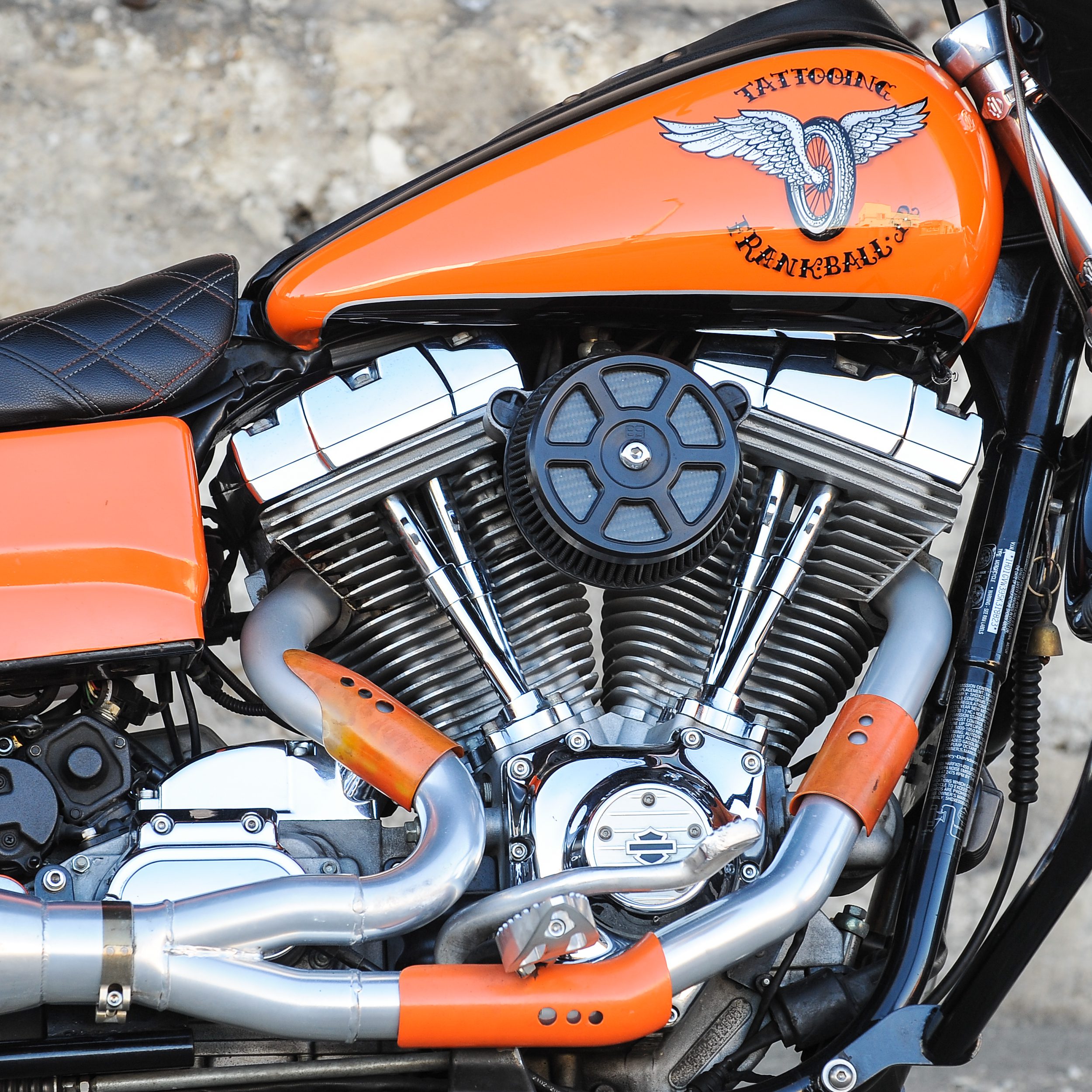 Alright, time move on to the matter at hand…the ripper we have featured here. Franks works as a tattoo artist throughout the LA area and needed something with the power and agility to run the rough highways and narrow city streets. He knew he wanted something that would have no problem dodging cagers and splitting lanes. Sounds easy enough, but there was one more feature that wasn’t optional, it had to be set up and comfortable enough to cruise the open roads for hundreds of miles too. When looking for inspiration for this project, Frank, Jr dug through his memory banks and remembered a Dyna Glide that his dad had owned. He fondly recalled Sr. letting him ride it around the block occasionally and being mesmerized by the machine. He knew then that he wanted to build something as close to that old Dyna as possible…he just had to make it better. Being an artist, he knew that the changes he would make would give this new bike some soul.
