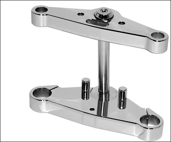 Paughco’s billet aluminum triple trees are designed to minimize handling, and front-end flop problems associated with altered front-end geometry. Specifically the 6-DEGREE TREES were developed to accommodate a number of their most popular chopper frames with 45° neck rake. Used in conjunction with these "raked" frames and appropriate length extended front ends, the 6-degree offset provides near stock “trail” dimensions which in turn virtually eliminates radical front end flop. The first of an innovative line of billet aluminum products currently in the works at Paughco’s R&D department, the 6-DEGREE TREES are CNC machined from 6061-T6 billet aluminum, polished and show chrome plated. The new trees are currently available in Wide-Glide 6°configurations utilizing 41-millimeter fork tubes and Narrow-Glide with 3° for use with 39-millimeter tubes. Paughco raked trees run $500.95. For complete details call 775-246-5738 or check the web at www.paughco.com.