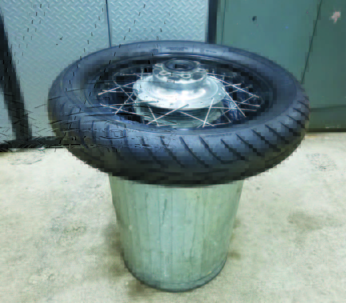 Submitted by Lee From Seattle Lee 2007 Softtail wheelie machine. He said I always see you changing tires on the floor in your tech articles. He is 70 plus years old. When he called, Lee said to me “I can’t get up and down like you youngsters do. When I change tires or service bearings. I set my tire on a 20-gallon drum or trashcan like equivalent. This gets it up off the floor for easy maintenance at a comfortable work height”. I tried this the other day and Lee is exactly right! Lee also said take a piece of rubber hose and slice one side of it lengthwise and put on the lip of the drum, this will help keep the rim from sliding around and scratching.