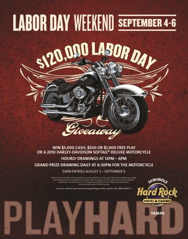 Seminole Hard Rock Hotel & Casino – Tampa will be having an exciting Labor Day giveaway. They will be giving away a Harley Davidson softtail deluxe motorcycle each day September 4th – 6th at 6:30pm. There will also be daily cash prizes during those days as well. From 12pm-6pm there will be hourly drawings for a chance at $500, $1,000 and $5,000 in free play. You can find more information at the link below: