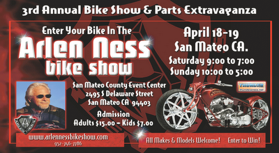 The Arlen Ness Bike Show will be hosted at the San Mateo County Event Center. Click here for Convention Center information.