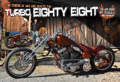 Dixon is a man who is up to his armpits in Harley iron with his shop Gas Axe Chop Shop in Ten Mile Tennessee. With the current number of bikes in his stable running at or near 27 bikes, the last thing he needed was another project. But that didn’t stop him from craving a turbo Evo powered bike. Everybody has that weird urge to build something but never really put the effort in because, well, it’s a novelty and not that cool old iron that keeps your shop runnin’. As chance would have it though, the project saw some light when he stumbled on a turbo Evo motor, complete from the carb in. It was brand new and ready to run, the engine was originally built by the legendary Steve Bowie and then stashed on a shelf. The original owner caught a case of life gets in the way, when he found that his wife was pregnant with twins and his project had to stop. The motor had been collecting dust and Tim was able to pick it up for less than a song and snagged the mill for less than you can buy any Knucklehead part for. The motor itself is eighty-eight cubic inches with an estimated 10-1 compression Wiseco pistons and a turbo grind cam capped with a Garret t2 turbo and a Mikuni 42 requiring an electric fuel pump to make it all operational. The turbo itself is oiled from a ‘t’ fitting running off the oil pump to feed it and then it runs back into the cam cover.
