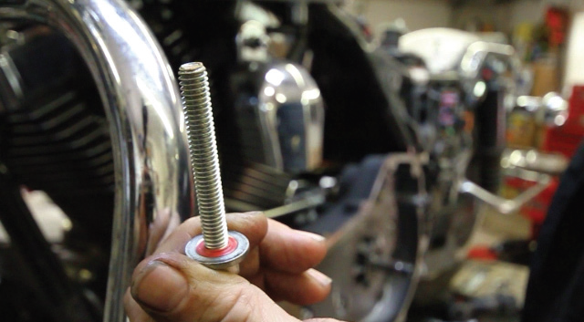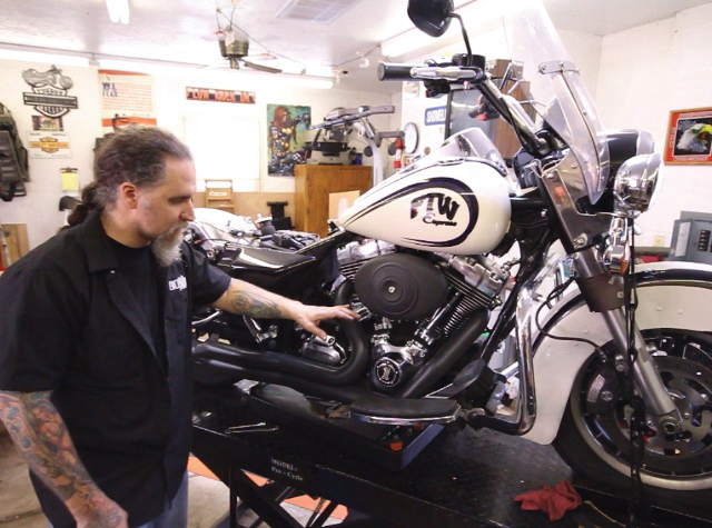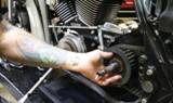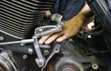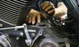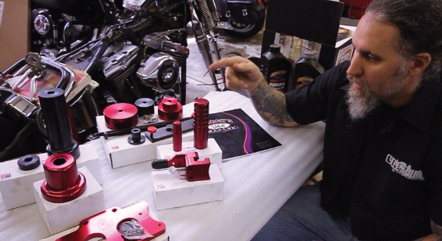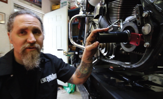 To do the job you’ll need a selection of special tools. The good folks at George’s Garage hooked us up with their products for this instance. Here you can see them laid out to get ready for our install. They’re all made in the USA at George’s Garage in California. So to introduce you to them, let’s go through the list: transmission locking tool #6200020, fits 1980 – present Big Twins; small main drive gear seal installer #620230 which is also the handle to use on the large main drive gear installer #620250; main drive gear bearing kit #620200 that removes and installs the main drive gear out and also is used to remove and install the main drive gear bearing; trap door puller #620210; and last but not least is our main shaft sprocket wrench that removes the nut from the front pulley from the secondary drive. On cruise drive 6 speed equipped motorcycles, ’06 to present Dynas and ’07 and up touring and Big Twins, they made this nut a 2-1/4 inch nut that is right hand drive. So, that old tool for your four and five speed trannys will not work here. All these tools can be ordered on at www.georges-garage. com and come with complete instructions on how they are to be used.