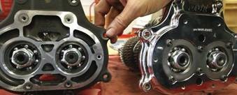 Side by side you can plainly see the difference from the factory six speed and the DD7. One of the most notable is in the trap door area. The Factory uses a snap ring to hold the bearings in place; Baker uses a six bolt retainer plate. A lot of times you will hear about ghost clutch lever movement on bikes with helical cut gears. This happens because of the axial thrust from helical gears pushes and pulls on the door bearings, so as the mainshaft moves so does the clutch. Baker’s fix for this was to put a 28% wider bearing then stock and fortify that area with a 6 bolt strong retaining plate.