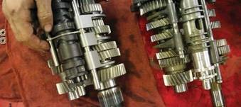 On the other side, we take the trans side and top covers off. If you leave the gasket on the top cover behind, you can place the shifting paw on it to keep it out of the way later.
