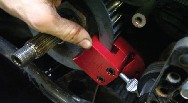 Remove the two Allen bolts on the front pulley lock plate. Check the nut and lock plate for any wear.