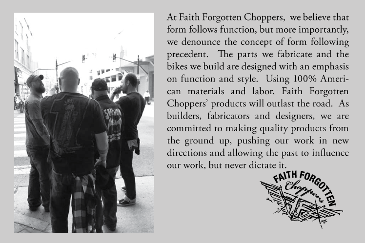Owner of Faith Forgotten Choppers, Will Ramsey started the company in 2009 with the intention of bringing high quality fabrication and balanced design aesthetics to his customers. In a quest for truth within an industry riddled with anecdotal production processes, he immersed himself in the scientific studies of Welding, Metallurgy and the history of Industrial Design. Will’s love for “timeless” vintage style choppers is evident by the classic lines of his bikes, but his use of modern componentry along with his precision fabrication techniques produces dependable choppers that perform at today’s standard. Contrasting polished metal against satin colors, distinguishes Faith Forgotten Choppers and maintains emphasis on the craftsmanship and detail of every design. With his focus on quality and style every bike Will builds can withstand the test of time.