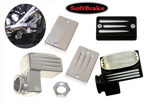 Mastercylinder with logo North Count Customs, the exclusive source for Softbrake accessories is now offering these very slick replacement rear master cylinders reservoirs and lids finished in black powder coat as well as show quality chrome.