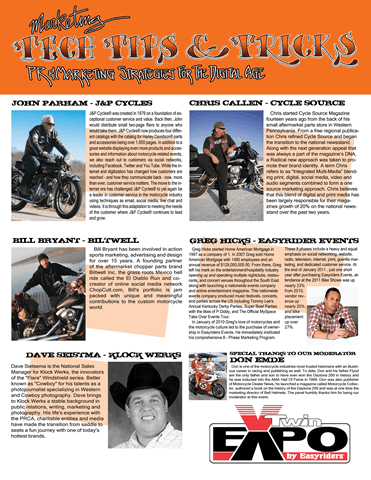 Please join Cycle Source editor- in -chief Chris Callen as he presents his Marketing Tech, Tips and Tricks seminar during the V-Twin Expo this weekend. the seminar will cover the in and outs of PR and marketing strategies for the Digital age. It will be moderated by motorcycling historian Don Emde.