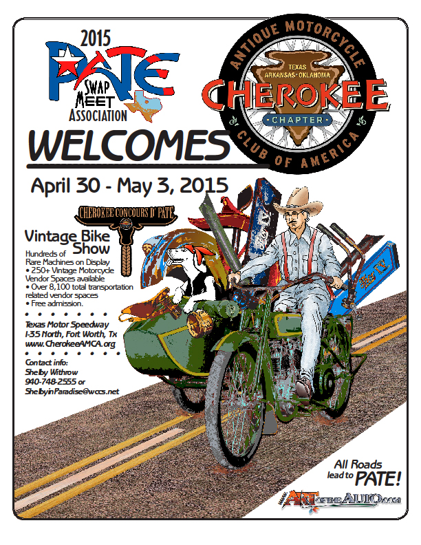 On April 30 – May 3rd the Cherokee Pate Swap Meet and Concours d’Pate Bike Show Event will launch in Fort Worth TX at Texas Motor Speedway. The Pate Swap Meet is in its 43rd year and has over 11,000 booths spaces for all things transportation related. The Cherokee Chapter of the AMCA has purchased 380+ vending spaces and has leased them to motorcycle related vendors from across America. We also are attempting to have the largest display of Vintage and Classic Motorcycles in Texas and the Southern USA. This Show is advertised in our inaugural year as a Shine, Show, Share and Smile Show.