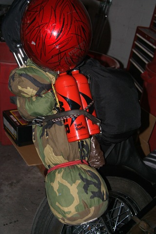 packing extra fuel on his bike in these cool 30oz canisters…. Amazing idea….