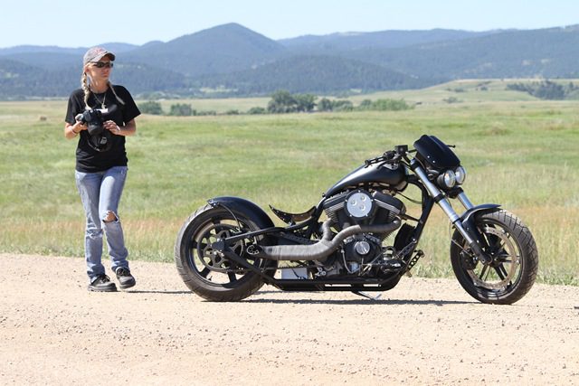 So if you are not aware, we have a new social and digital media person at Cycle Source, Kerri Schindler is her name and we had the privilege of working together for the entire Sturgis Rally this year. I watched as Kerri embraced the insanity that is Rally Week with both arms. She shot bikes, did dishes, ran the booth and other than a few moments in the beginning where it seemed like we might break her, she did it all with grace and professionalism. I know it can be a hard gig and we just wanted to say thank you from the staff. Here she is shooting a Twisted Chopper Buell that will be in an upcoming issue.