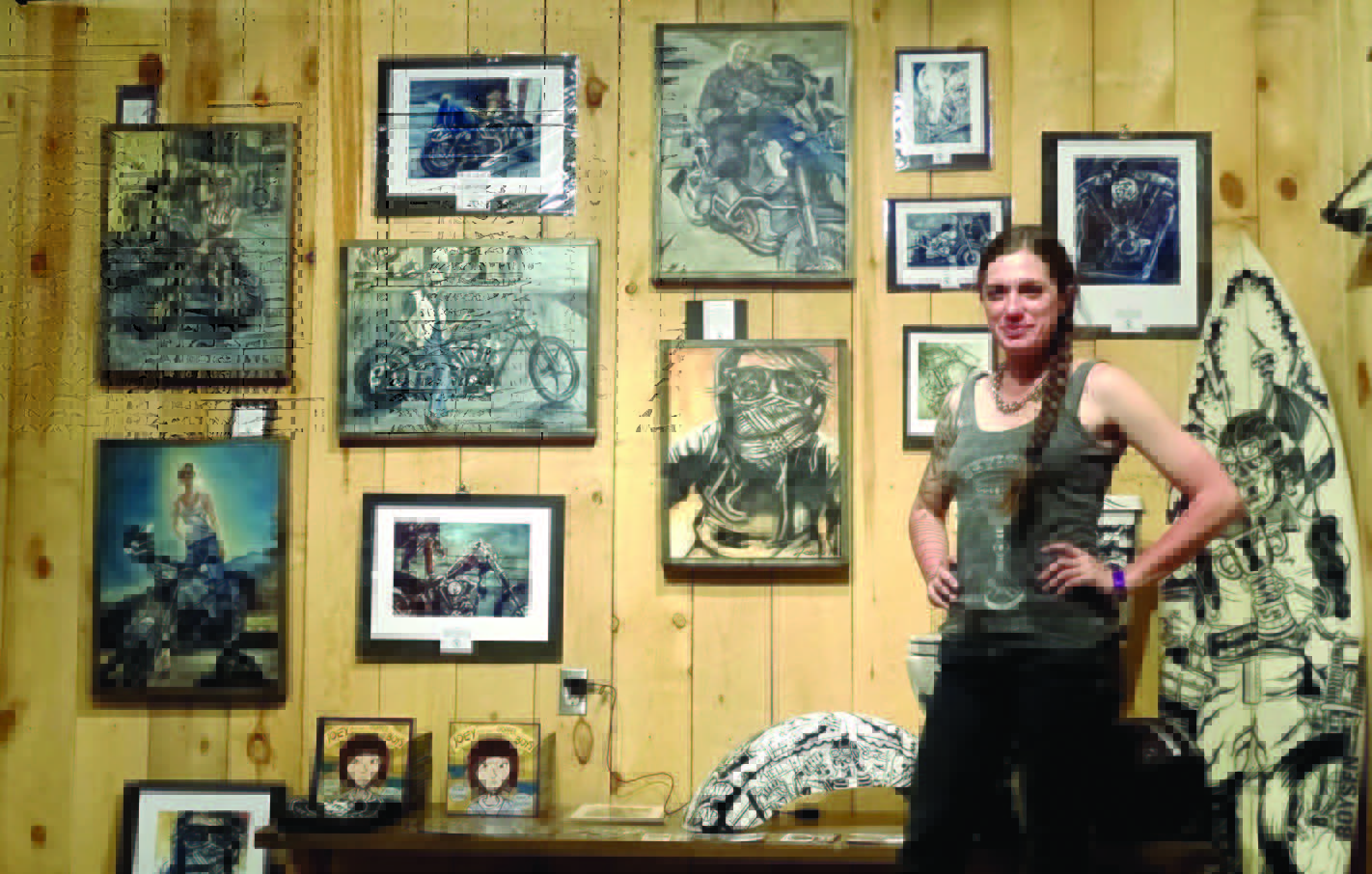 In February of 2012, Kayla painted one of her first motorcycle pieces, and by June she was showcasing them. That same year was when her current business, Inferno Art Studios, was founded, and since becoming involved in the crazy culture that is moto-art, Kayla has been lucky enough to travel crosscountry, and connect with some of the biggest names in industry art; Michael Lichter, Richie Pan, and David Uhl to name a few. A favorite experience of hers was years ago when she, Chris, and Richie Pan all painted on one canvas together. Despite the fact that their brushes only briefly touched the canvas, it was the sense of a community of artists working together that was truly awe-inspiring. To create the beautiful pieces you see in this article, Kayla has a few favorite mediums she likes to use. Ink, because line is the most expressive detail in some of her work and the ability to change thickness and shape gives it a certain elegance. On the other hand, she also favors, like most artists, including my dad, oil paints. It dries slowly and allows for multiple layers that give physical and implied texture to the piece. Alongside her favorite mediums, she also uses the “unforgiving,” watercolor and enamel. These mediums are harder to work with because once you lay them down, they won’t move, which tests the artist’s ability to think ahead and plan out their approach. Lastly, Kayla works in acrylics, because they can do things others can’t, while also being limited in comparison to oil and ink.