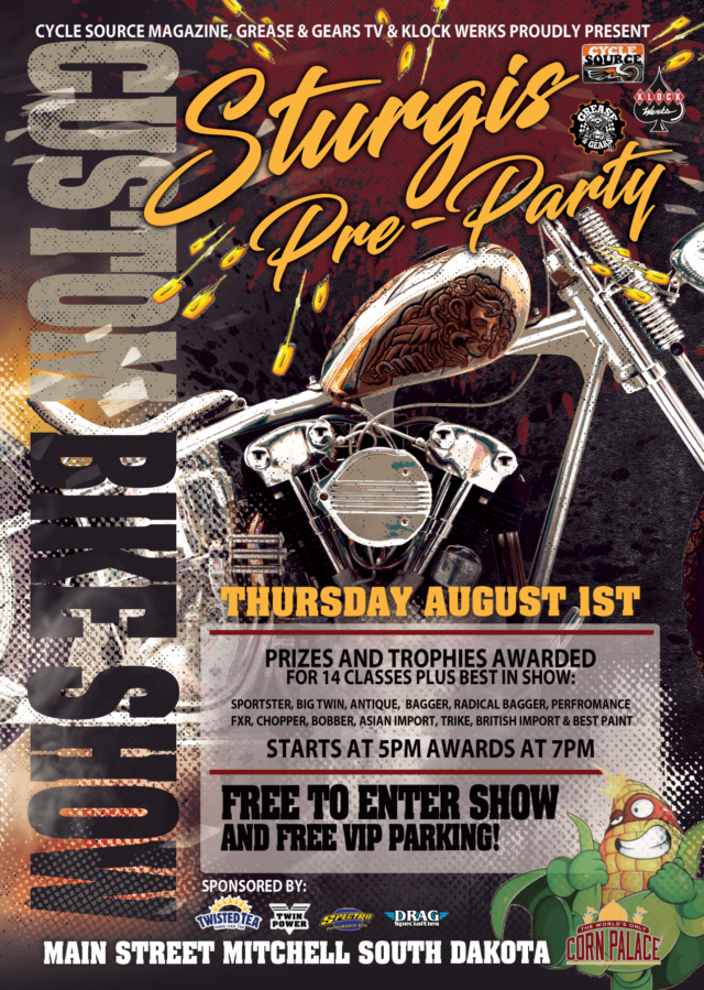 For the second year in a row, Cycle Source is starting its Sturgis adventure in Mitchell, SD, with a custom bike show right on Main Street. There are awards in 10 classes, and not only is it free to show, but just for entering a bike, you’ll Get a killer pack of ShineWerks. Look for the Cycle Source tent on the corner of 5th and Main! Hope to see you all at the Corn Palace!