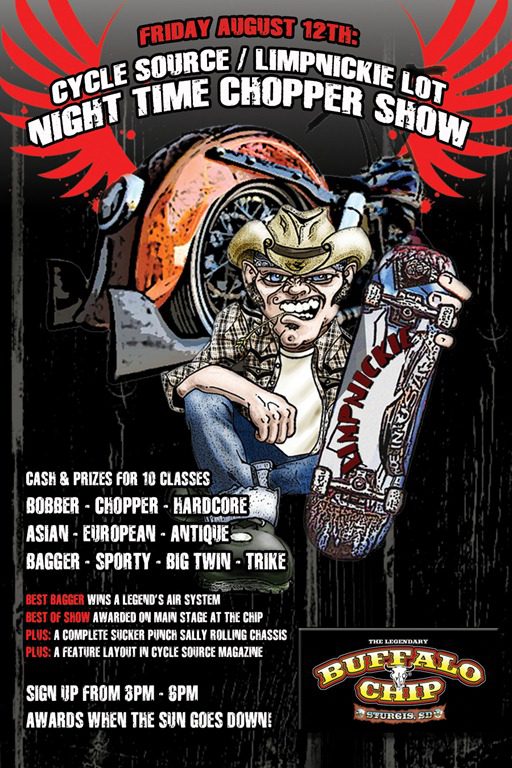 Oh yeah baby, the Cycle Source Magazine’s Annual Night Time Custom Chopper Show is ready for Sturgis. We’re looking for some killer bikes to haul away some great prizes along with hand made trophies from Kevin “Teach” Baas. What are those prizes you ask? Well, an Evil Primary for the Best Bobber of the show, a Legend Air Suspension for the Best Burly Bagger of the show and for the best overall winner, a complete Sucker Punch Sally rolling chassis and a full feature in Cycle Source Magazine. The show will be held in the Limpnickie Lot at the West Gate of the World Famous Buffalo Chip and there is no cost to enter or to show a bike. The lot will be open until 8pm at which time we will all head inside for Limpnickie Night. There, we are gonna’ tear it up to the sounds of Tesla, Saving Able and headliner Puddle Of Mudd.