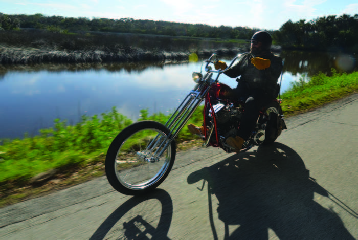 Now I was diggin’ this man; no hassles, no assholes, good times just riding and hanging out with my buddies. Don’t get me wrong, all around me there were plenty of scheduled activities. The Dog House had a killer event for Soldiers’ Angels that was attended by many of the big names in our industry. Also on hand was the world famous Gunny Ermey from Full Metal Jacket. He was there to support Victory Motorcycles. Robinson’s was celebrating their 50th anniversary this year. Jeremy Johnson hosted a ride for the Cathy’s Help Charity Foundation, and as usual, the folks at Rossmeyer’s had a lot going on. There were bike shows all over town, a couple different lots setup like the Limpnickie Lot, the Chop Lot across the street, and the Chopin’ Block up at the Broken Spoke that featured collections of builders and their wares. All the bars were full, as full as it matters for me because I was indifferent to how much the attendance was either up or down. In short, it was business as usual in Daytona. As bad as it might have been for business, I didn’t even once wear a Cycle Source T-shirt for the week. I was conducting my own sociology experiments. Could I find my way back to a better time at bike week? The answer came quickly, almost as soon as I got there. We spread the news by word of mouth that we were doing a little ride, nothing organized, just a ride around the loop. My brother Bobby from Indian Larry was in town and I wanted to do some riding with him. Bobby had left his plate at home in NY, so a little cardboard cut-out was affixed to his bike. We ran all over town like idiots on choppers and never once got hassled by the man. Back to the ride…. Like most things the magazine does, it was a little disorganized. But, we had a blast, at least I did, and man the Wildlife Loop in Daytona is so beautiful that I rode it a second time the next day with Mala from Kopteri.