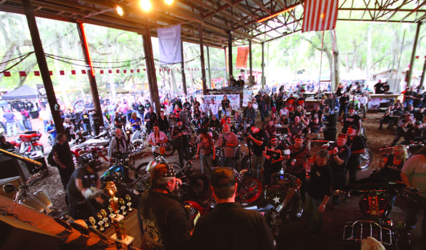 Next up was the collaboration between Cycle Source and the Chopin’ Block builders. This would be a ride taking the Daytona Loop which happened on Wednesday and was gonna be hectic ‘cause it was the same night as the Cycle Source party. This was also when my band was playing their first gig. For my part, that meant we’d have to keep a tight schedule and race around a little bit to get it all in. It didn’t help that my lazy ass hadn’t even changed the plugs on the Panhead all winter. Bobby Seeger flew in with my newly repaired gas tank from when my bike fell over in the van leaving Brooklyn a few months back. The morning of the ride saw me, and everyone I could persuade, scrambling like mad to make The Ticket road worthy and then get it running. About a hundred kicks later (hell yes I promise to be a better bike owner after that), The Ticket fired up and about 50 of us pulled out of The Spoke to cruise the park roads. One of the greatest things about the Daytona Loop is the Fairchild Oak Trees that lean all the way over the road and are one of the oldest oaks in Florida. There are parts that they provide so much shade that it literally drops ten degrees or better. Since it was gonna be a tight day for time, I had to split about halfway through the ride so I could help get the band set up for the night’s events.