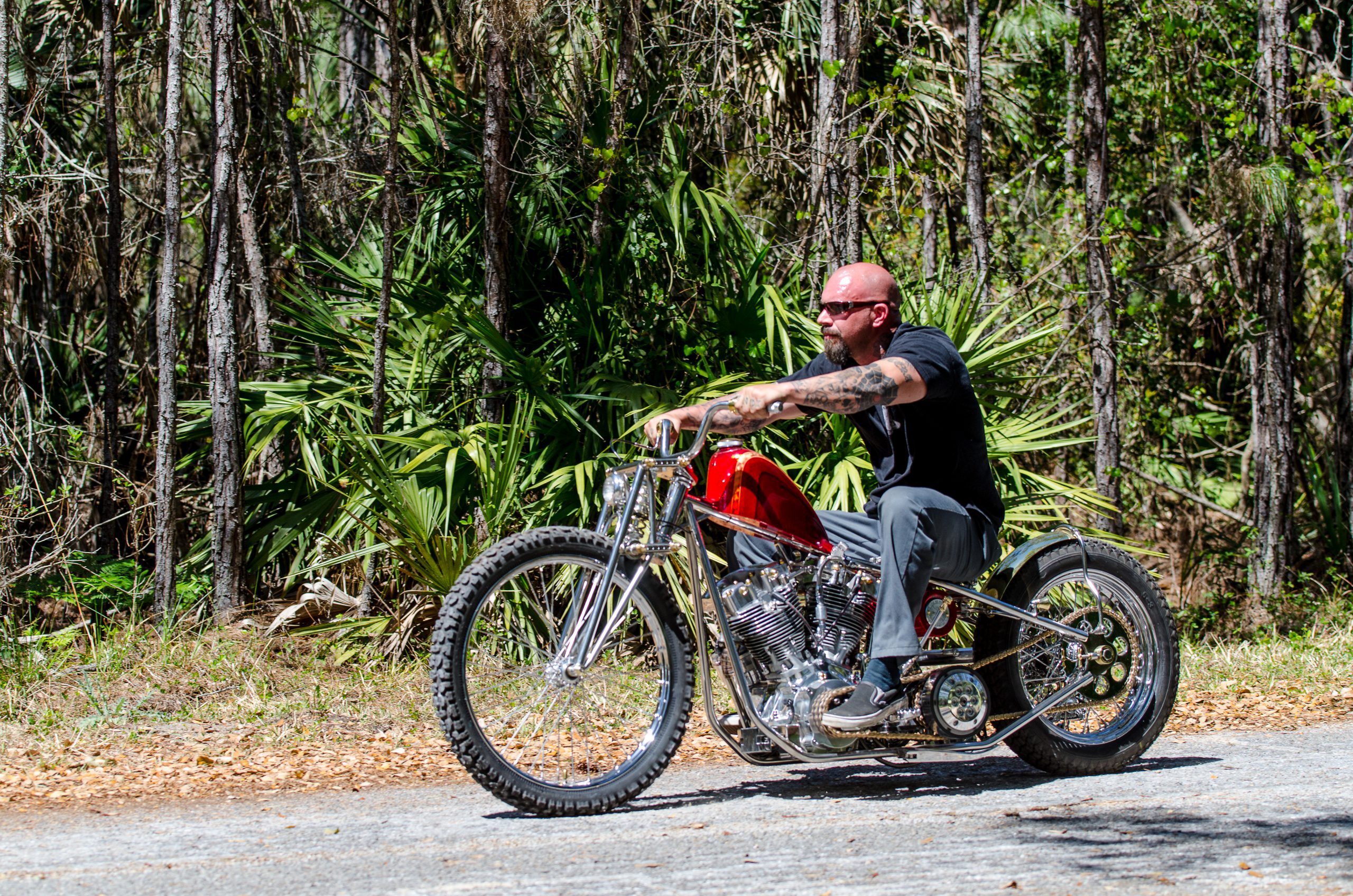 He started with the frame, working his way up to building his own Girder front end. With nothing but his own vision guiding him Brian laid out the perfect design in his mind and went after it. With the stance precisely like he saw it, he began adding some killer touches at the mounting points. Since the frame is as smooth as glass, these choices were made carefully, as not to interrupt the long straight lines of the chassis. When it came to the motor, Tom at Red Racing in Pompano was the man. He switched that old Shovel up and made sure that nothing was left to chance. This would be crucial in Daytona as Brian rolled the bike up to get his award at Willies and Roadside said that it looked great, but then asked if it ran…. One kick later, the bike fired to life and Brian secretly shit his pants. You see, like most of us motojunkies, he was working around the clock, with no food, almost no sleep, just to get it finished for Daytona. Even as it sat ready to make the three-hour trip to the beach the morning he left, he toiled away at the last few details. He arrived just in time to find a few bugs that needed to be shaken out of the braking, but he had a runner, and the looks blew peoples minds too. During his time at Bike Week, he took four of the most prominent awards you can get. Starting off with our show at the Broken Spoke where he got “Best Chopper” on to Willie’s where he took “Best of Shovel” and then “Best of Show” at Boogie East. He ended the week with a “Best Bobber” at the Rat’s Hole Show, making it a clean sweep. Although Butteras is far too humble to pat himself on the back, it’s good to see someone with such a great story of being guided by the passion for what he wants to do, get such a great reception from our industry.