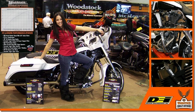 The Progressive Insurance International Motorcycle Shows recently made its way to the “Windy City” showing off the latest offerings from all the major OEM’s. As a part of the show, local dealers are also invited to showcase customized bikes, stoking the customer’s imagination on what is possible. With this in mind, Mike Witt and the crew over at Woodstock Harley Davidson Performance division saw an opportunity to showcase their skills and got to work. The build started with a stock 2014 Street Glide, but this exercise wasn’t about slapping on some paint and a slip-on exhaust. This bike is made for show…and go. They installed a complete Woodstock devised 107CI Engine Performance Package along with Xtreme True Duals from Reinhart Exhaust. The result is a tire melting 131HP with 118Ftlbs of torque.