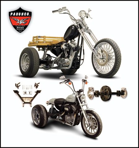 Paughco’s new TRIKE CONVERSION KITS have got to be the coolest thing to hit the industry since Capt. America. Seriously, Paughco has made converting your Sportster from 2-wheels to 3 a simple, do-it-yourself proposition that is certainly going to evolve into a whole new trend in chopper design and styling. While the company will be offering these bolt together tike kits for most popular H-D models they are currently shipping the custom swingarm and rear axle pieces required to make the Sportster conversion. Both of these components bolt directly in place of the stock swingarm assembly and utilize the stock belt or chain, depending on model. Once fit all you have to do is add your choice of GM 5 x 4.75 bolt pattern wheels and tires and you’re set.
