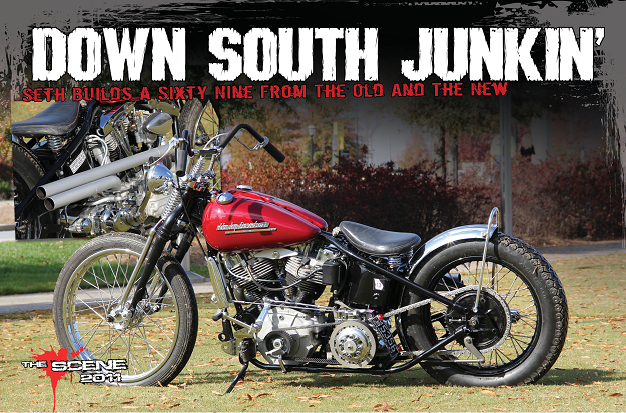 This year, at the Easyriders’ show in Atlanta, the Limpnickie Lot builders would pick this bike as their favorite of the show. Seth said he was honored that the cats whose bikes he had been drooling over all weekend, decided to give him a nod. Seth says that the Sixty-Nine is in a constant state of metamorphosis, just like most of the bikes in his area. They redo ’em over the winter, then ride the piss out of them. For this one, a set of stainless pipes are next and a spool hub from Jr’s Cycle. Seth’s starting on a ’52 now also, maybe in the next month or so when the shops starts to slow down for the winter. Until he finds the bits and pieces he needs for that, you can find him doing his part to keep Atlanta riding.