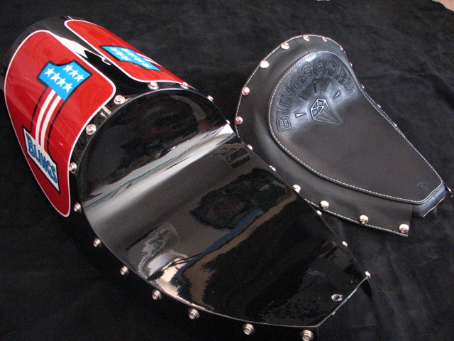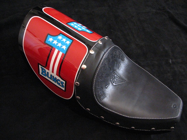 Earlier this month Duane was asked to form a seat for Bill Dodge’s, of Bling’s Cycles, new Café Racer project. Most café style seats are just made out of a piece of foam, covered with vinyl and attached with snaps. Duane has created a full seat, starting off with a custom pan, then shapes and forms the foam for your comfort. The top is made out of 7 oz #1 grade cowhide that can be tooled with anything you desire.