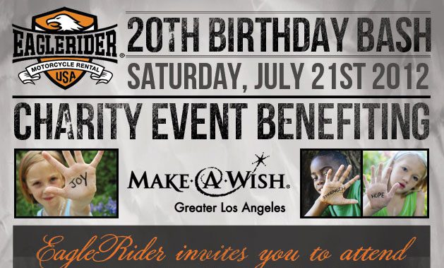 EagleRider, the world’s largest motorcycle rental and tour company, has officially unveiled its plans today to celebrate its 20th anniversary with a three-day event at its World Headquarters in Hawthorne, CA, benefiting the Make-A-Wish® Greater Los Angeles Chapter. The celebration will begin on July 19th with a motorcycle sales event and conclude on the evening of July 21st as EagleRider will transform its headquarters into a red carpet entertainment extravaganza featuring live bands, DJs, charity casino, motorcycle stunt teams, EagleRider Girls Fashion Show, lavish VIP packages along with some of LA’s best food trucks and retail vendors. EagleRider encourages all motorcycle enthusiasts to participate in a Charity Poker Ride starting in the morning on the 21st (benefiting Make-A-Wish as well) in the LA area for a chance to win prizes. All events are open to the general public.