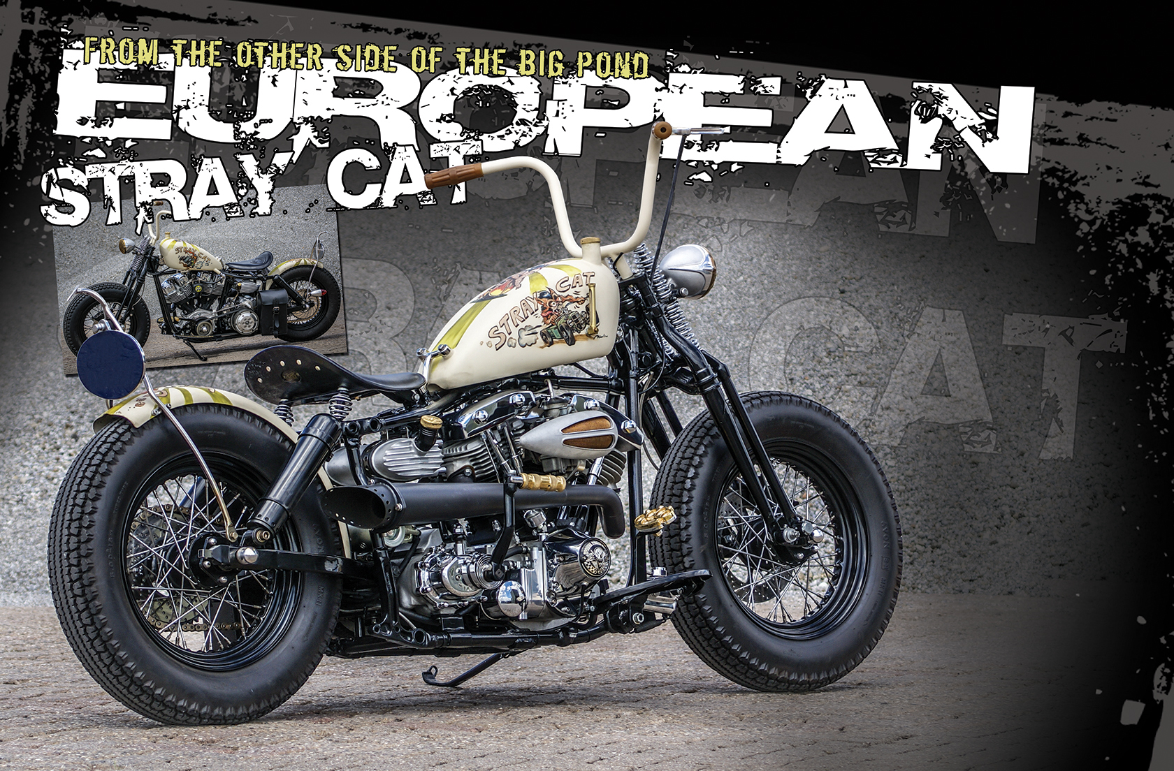 There is more oneoff stuff to be found on this bike which makes it a cool two-wheeler to photograph. I personally love the Swiss style license plate, the devil’s tail sissybar and that cool two-intoone hotrod exhaust. William, from the Dutch town of Meer, made the leather belt that holds the battery and the sweet seat. Nicolien is the talented woman who painted the bike; maybe the most striking aspect to be found on this Shovel. Artist Nicolien normally does oil paintings on linen, but this time she tried her art on the sheet metal of John’s Shovel and I think it’s an amazing result. “We decided to call the bike Stray Cat because before riding it (which I do a lot by the way), I had planned to have it at many a bike show. We went all over Europe, taking it from Verona in Italy to the Thunderbike show in Germany. So like a real Stray Cat, my bike has been everywhere,” John said.