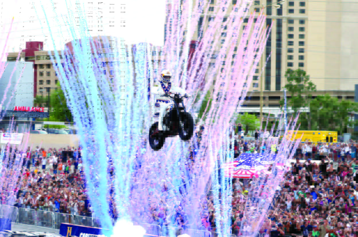 Arriving in Vegas, I knew I wasn’t guaranteed all access just because I’m a member of the motorcycle media. But I was hoping I’d be in a position to view, photograph and take video of all three jumps. As I rode from the airport to the hotel, I got to pass by the car and buss jump site. The Greyhound bus jump looked long. Really long. The AC in the car couldn’t keep the cold sweats from materializing—this was a life-ordeath jump. I’d seen all the footage from Evel’s crashes, and, no matter how many times I viewed them, they always made me cringe. Was this going to be an iconic crash or a history-making trifecta of a day? As we pulled up to Caesars Palace I noticed the ramps, chain link and no-air fences and a very short take off ramp. I made my way through the lobby and was greeted by a wax replica of Evel, a cutout of his Indian FTR 750 and an awesome backdrop. I just happened to catch legendary skater Christian Hosoi as he was getting his picture taken in front of it. The History Channel, Caesars Palace and Nitro Circus were pulling out all the stops for this event, and it was great to see a mainstream media source backing our sport. After I got my credentials, some of us media members were shuttled over to a neighboring property to the first two jumps sites and led to the media bleachers, which thankfully had some shade and was stocked with ice-cold water. Out of all the media there, I was one of two motorcyclespecific outlets I talked to. Most were mainstream media outlets, like the AP, sports shows and local TV and radio. The heat index climbed steadily, and clouds started to roll in, threatening rain. The wind picked up, blowing in with gusts of over 15 miles per hour. The first jump was really a warm up for the second jump, which seemed to be the most extreme.