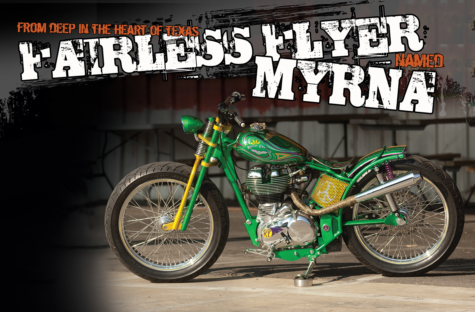 When it came to mounting, these guys did an amazing job with some killer little handmade mounts that are as much about form as they are function. There would be somewhere in the neighborhood of a hundred pounds of unwanted parts that would have to be removed from the bike to get down to the basics of where Fairless would start to work his magic. With only three months to get this tall order together, he’d have to work fast and make good decisions. Instead of going with the same 17 inch wheels that come on it, Rick would swap them out for 21/140s and give the bike a tall, skinny stance. It also lends itself to changing the rider position to that of a more low slung perspective. Other handmade parts like the fender struts and taillight went a long way towards making the project into a Fairless original as well. All the little details like the tasty little foot controls, the screened in oil tanks and tracker style bars really bring the design together. Even the way he mounted the fender with the traditional looking loop over it from the struts keeps that unmistakable styling from t h e Enfield era. Planning was a key element here since a little too much in any spot could offset the balance. The tiny Performance Machine sprocket/rotor combination went a long way to keeping the back wheel nice and clean. If there had been a big, clunky caliper deal back there it would spoil the British look and that wouldn’t work for Rick. Keeping with that same tradition, he even managed to make the throttle body look like an old Amal carb with a velocity stack sticking right out of the side of it. Rick told me that he named this bike Myrna after the TV actress Myrna Loy who played the wife on The Thin Man. She was a beautiful and funny woman and there was just something about that time period that seemed like a good fit for this build. No matter what the name is, he did achieve the goal he set out for. Right before the IMS show, one of the big wigs from Royal Enfield flew out to see the bike and agreed with Rick that he had in fact created the coolest Enfield on the planet. But how about the new Royal Enfields: all show and no go? Not on your life from this cat. He builds them to ride and wouldn’t sell anything he doesn’t believe in. Strokers recently sold one of these bikes to a customer who flew in from Houston, rode it home and then immediately took it on a three week road trip to Vermont. This guy said he went from farm road to farm road on eighty miles to a gallon and had the best trip of his life. Not too bad for a bike that just came along with the idea that an electric starter is a good idea, huh? On any Saturday or Sunday you’re bound to find 2,000 bikes just hanging out for the day. Anyone from Ross Perot, who brings in visitors from out of town, to patch holders, Strokers has become a Dallas tradition. And trust me, after knowing Rick for a good handful of years now, I can tell you it would be hard to find better people to spend time with. Rick also told me that none of this could have been done without Gene Slater, Ford Stell, Derek Tollenaar & Matt Ambroz.