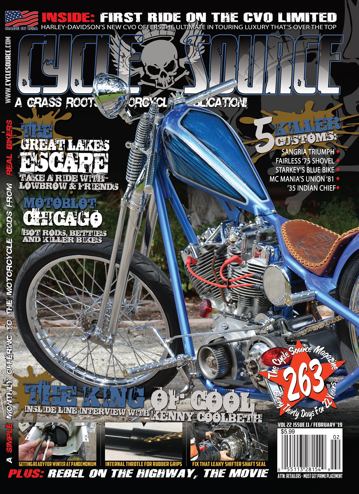 In this issue of Cycle Source Magazine Dan Starke’s show winning bike from Tropical Tattoo graces the cover. Dan is a up and coming young builder who has attracted a lot of attention with this bike and we’re thrilled to bring you the story. Finally we get to share our experiences with an event in Chicago this past summer called MotoBlot. It was a killer time and you should go, trust us!