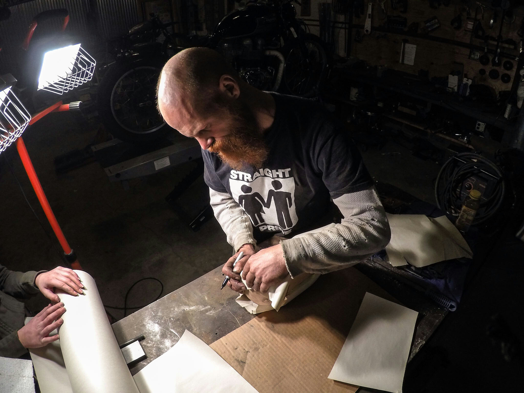 Jeremy Cupp with L.C. Fabrications in Grottoes, Virginia draws out the template to an oil tank he is about to fabricate for The Heroes Run raffle bike. Jeremy has offered his talents and assistance for the charity event in Richmond, Va on September11th that benefits children with cancer. After shaping a “buck” out of wood that will be the form to shape the metal over, he uses paper as the preliminary material to create the outline to be traced onto the sheet metal. The final product will adorn the custom chopper built by Justin of the Heroes Run. One lucky recipient at the end of the event will become the proud new owner. You can follow Jeremy’s instagram @lcfabrications and give the Heroes Run a follow as well @heroes_run. If you are in the Richmond area in September come support a great cause put on by great people.