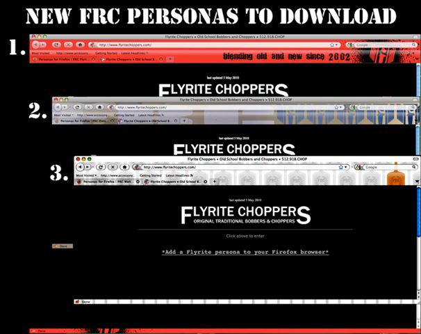 FRC_persona Once again the guys over at Flyrite Choppers are on the cutting edge of what’s happening. Cruise over to their web site to find the link to their new FRC Personas. What is a Persona you ask? Only the coolest new way of dressing up your Firefox web browser. Chose from one of the many FRC themes available from mild to wild. Be the first one on your block to have a FRC customized computer. Give Flyrite Choppers a call or drop by www.flyritechoppers.com for more information.
