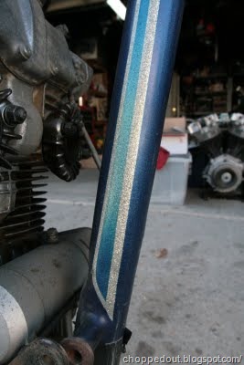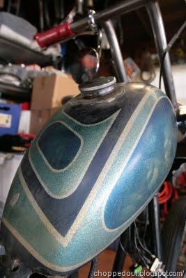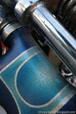 This bike was supposedly built around 1970 and was also supposedly painted by Raja, Roger Castano. The hardtailed frame is fully molded and paneled to match the peanut tank. There is a Randy’s springer on it that measures about 48 inches from the axle to the bottom neck cup, not sure what the rake is.