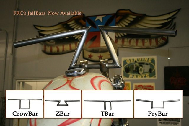 Flyrite Choppers, always a leader in style, has a soon to be famous line of custom bars. The bars come raw and ready to be finished to match your bike. All five styles (JailBar, ZBar, CrowBar, TBar, PryBar) feature 1" steel tubing no recess, no knurling. Introductory price only $69.