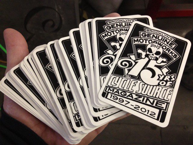 Ok, so not only are Bobby and Elisa throwing us this bitchin’ party in the city at Genuine Motorworks, not only will we have some of the coolest cats from the motorcycle, art and music industry to hang out with but now they told me that they have commissioned a special commemorative patch for this event and the first 75 people who come out will get one free. The cats at Iron Thread are putting the finishing touches on these things right now and man, they’re gonna be bad ass.If you aren’t one of the lucky 75 that do get one, they’ve had some stickers made in this same design as well. Hell I might go as far as getting this tattooed on my body somewhere if there is an artist on site…..