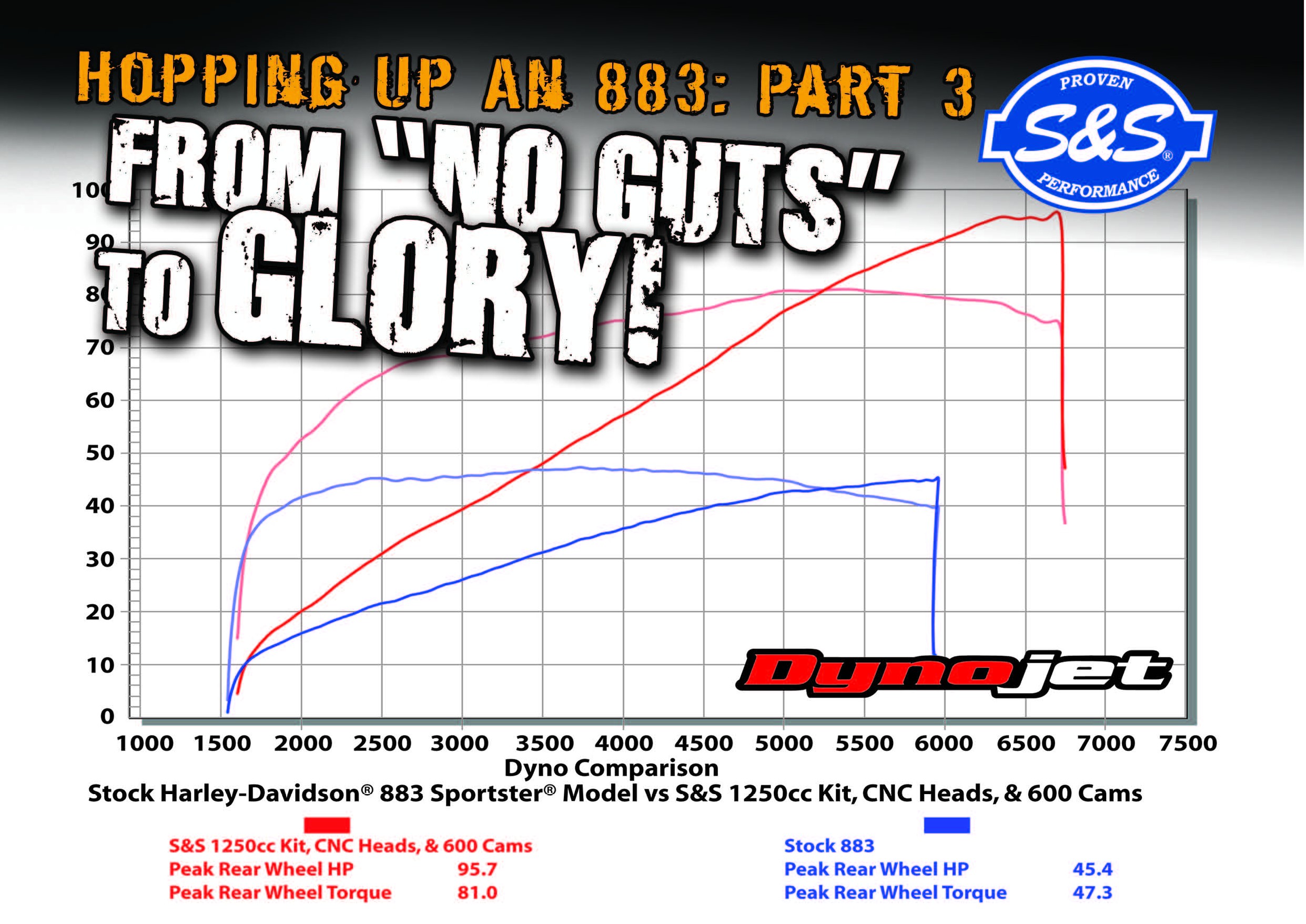 The spigot diameter of the S&S 1250cc conversion kit cylinders is the same as stock 883cc and 1200cc cylinders, so the new cylinders slid right into the crankcases without any machining or clearancing. No rebalancing either! Truly a boltin kit. See Dyno Chart Top Left Is this the same bike? Yes, but with a lot more power. The DynoJet® 250i shows that the S&S 1250cc conversion kit, 600 cams, Stealth air cleaner, and slip-on mufflers added 50.3 horsepower to an engine that originally put out 45.4 horsepower. That’s over twice the power. It’s worth mentioning that if we hadn’t cranked up the rev limit to 6750 rpm, we’d have only made about 90 horsepower instead of 95. That’s still pretty respectable, but who couldn’t use 5 more horsepower?