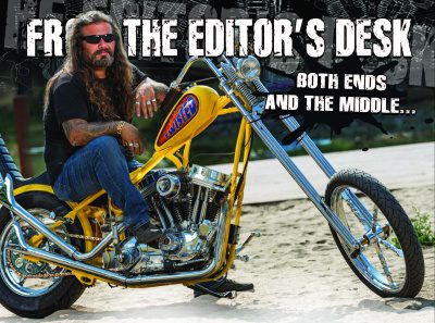 This leads us to the last two weeks before we leave for the Black Hills. The Tea Tracker is in final assembly as we speak. The Pro Tracker needs two more days of fab work and then it goes to paint and “Something Wicked” is a complete roller in my living room that scares my dog and makes it hard to see the television, which at this point only serves as background noise to keep the hum of the stupid between my ears from becoming deafening. At this moment there are five shops: RJ in WV, Mark in Pittsburg, Matt in WV, Donny Loos in Ohio and Big Will in Indiana, who all are working on some part of one of the three of these bikes. Motor here, tranny there, Mark is covered in seven colors of paint, and we are on deadline for the issue you are holding right now. I guess the good thing is if you are reading this we made at least one of those deadlines. As for the bikes, we’re giving it hell, and it will have to come down to the wire. But I kinda think that’s where the moral of this story is.Just like I found in my younger days, too much of even a good thing can be dangerous. As big as the honor of being involved in all these projects are, I would wager that the enjoyment of them individually would be far greater at a little slower pace. I think in that, I am writing this as much for myself as I am for you, as a reminder, to do a little less, get a little more. Now, don’t get me wrong, it would be a sin for me not to be thrilled with what we got to do this year but as I look over at Heather, glasses on top of her head, crazy hair and a phone stuck in her shoulder, so she can type as she talks, I realize that this has been harder on the people around me than it has on myself. I’m obviously crazy, and these poor bastards are sane, or at least were at the beginning of this year. In any event, protect your sanity, or stave off the crazies a bit and slow the hell down. You might get a little more out of life a gear below the one you’re in. What the hell is this bolt to?