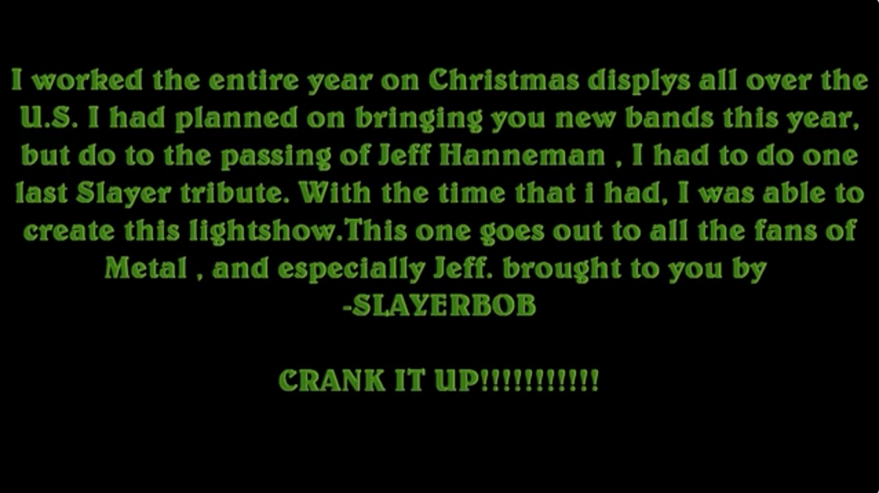 Congratulations to Slayer Bob for his amazing Christmas display tribute to Jeff Hanneman. This light & sound display is truly spectacular! By the way…be sure to watch past the 2:00 minute mark ’cause it just keeps getting better and better!!!