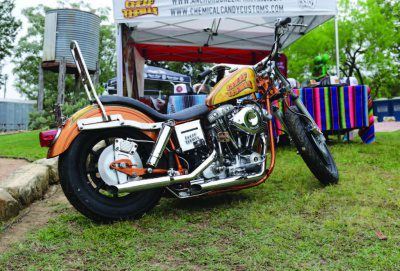 We woke up the next morning, as fresh as.. well, as fresh as a bunch of campers deep in the heart of Texas could be. I hitched a ride on a buddy’s p-pad down to the show – which takes place at the River Road Ice House in New Braunfels. This venue is incredible – from the killer bar and stage setup to the vast backyard full of vendors. There was everything from Helmet Division slingin’ and relining helmets, to Cheap Thrills, Sweatshop Industries peddling sissy bar bags, Danger Dan, and vintage shops, and of course, BBQ and tacos! The invited builders’ bikes lined a steep???? hillside, with incredible builds from Texas and beyond. Dream Co. Cycle Supply brought down his pan, along with Jace (whose belly reads CORNFED) and his “Vacation Forever” swingarm chop. Ben “The Boog” brought his Prismic Boog out too! Giddy Up is a one day show, and it likens back to the early days of Born Free – it’s high caliber, Texan fun, with Lone Stars aplenty, warm sun and good people. I foresee this show continuing to grow; it’s already hard to beat!