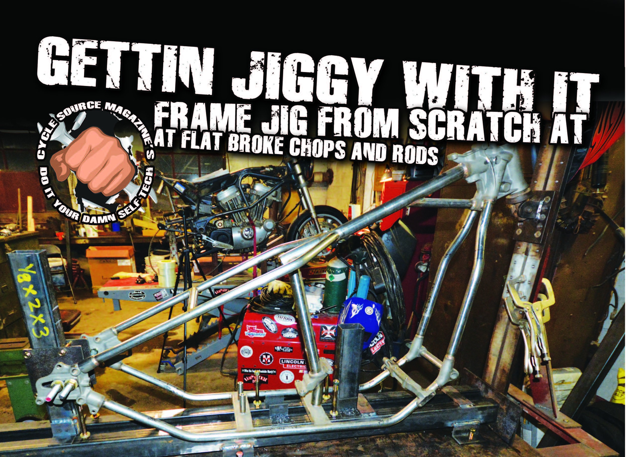 This month Cycle Source moved the Source Garage into its new home at Flat Broke Chops & Rods. The first order of business is to get ready for the upcoming winter projects. Since quite a few of the projects involve the manipulation of a frame in one manner or another, we needed a frame table. With the help of our brother Flip, we got the use of his table but it was just a reference table with only the front upright and neck fixture. After a few hours of looking around and asking questions of some builders I know, we decided to just build our own frame jig. The plan would be to build a modular jig that will allow us to work on sportsters and big twins alike. That said, this article is one example of how to go about this task. While we make no warrant that we are experts and you may find a better way, one thing we can tell you is if you intend to work on motorcycle frames (hard tailing, raking or the like) you should be able to build your own jig. By doing this you learn so much about the frames and what you need to pay attention too in their manipulation. We’re a bunch of knuckleheads that are always down for learning something new so here goes.![]()