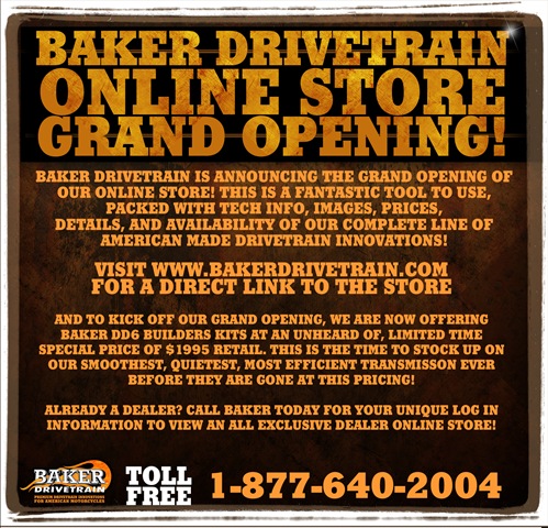 We are proud to announce this leap into the technological age, as we’ve put over a year of hard work into creating a full service customer experience for our Dealer and Retail customers alike. This site is packed with all the technical information, pricing, shipping info, images, upgrades, and unique customer profiles, allowing everyone to have complete access to everything they need to research, and order Baker products; even at 3 a.m. while your wife is asleep but your bike calls for you from the garage. We understand the need for that midnight snack, so to speak; so log on and look at all the fantastic,