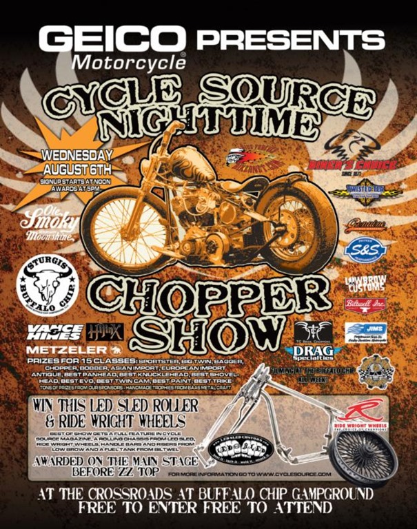 Oh yeah baby, the Cycle Source Magazine’s Annual Custom Chopper Show is ready for Sturgis. GEICO Insurance is bringing the Cycle Source Magazine’s Annual Custom Chopper Show to the Legendary Buffalo Chip CrossRoads for our 8th annual Sturgis show. The Black Hills Rally never disappoints when it comes to killer custom bikes and we’re ready to lay some great stuff on them. Winners and participants this year will be treated to a plethora of goodies from the likes of S&S, JIMS USA, and Biker’s Choice, Bikernet, TC Bros and so much more. Handmade trophies from Kevin “Teach” Baas will be awarded in 15 classes. For 2014, thanks to GEICO Insurance and Led Sled, the Best of Show Winner not only gets a full feature in Cycle Source Magazine but will be the proud new owner of a rolling chassis outfitted by Led Sled Customs, Metzeler Tires, Ridewright Wheels, Lowbrow Customs and Biltwell! The show will be held at the Buffalo Chip CrossRoads. It’s free to enter and free to attend!